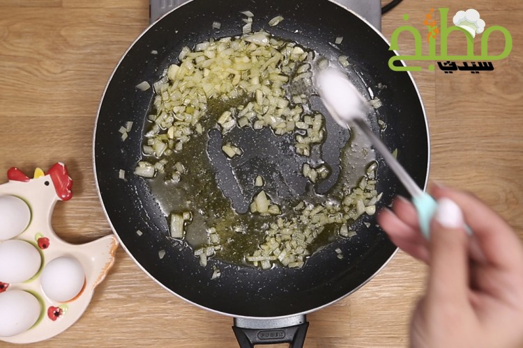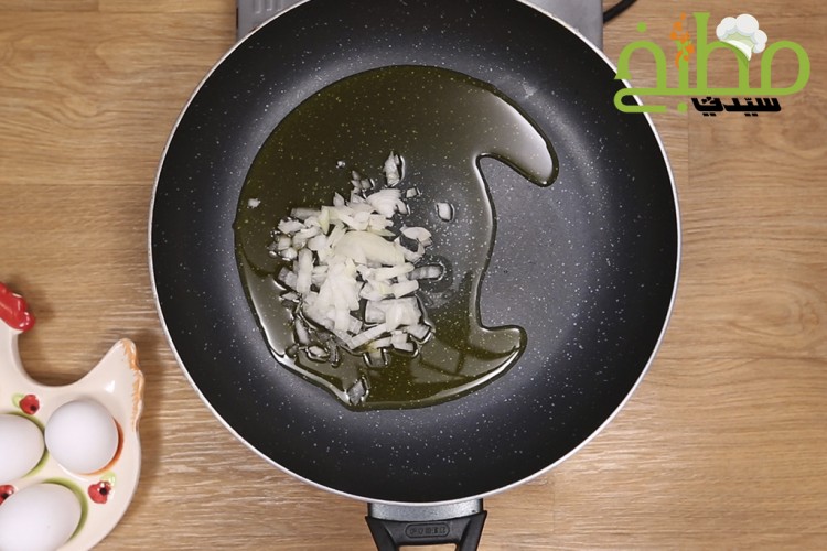 قلبي البصل مع زيت الزيتون في مقلاة غير لاصقة على النار