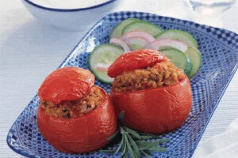 - تُحشى الطماطم المفرَّغة بالفريكة المُعَدّة وتُوضَع في صينية للخَبز مدهونة بقليل من زيت الزيتون وتُخبَز في فرن محمّى على حرارة 200 درجة مئوية لمدة 35 دقيقة أو حتى تنضج الطماطم.