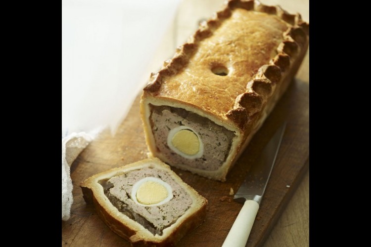 9. لإعداد الهلام: تغمّس أوراق الجيلاتين في الماء البارد إلى أن تصبح طرية (كمية الماء ليست مهمة). يصب 450 ملليلتراً من الماء المغلي فوق مكعب المرق، ويحرّك جيداً إلى أن يذوب. يخرج الجيلاتين ويعصر لإزالة الماء الزائد، ويضاف المرق. يحرّك إلى أن يذوب. يدع المرق يبرد قليلاً ثم يصب في الفطيرة، وتستخدم أكبر كمية ممكنة. تعاد الفطيرة إلى الثلاجة ويدع الجيلاتين يستقر قبل تقديمها.