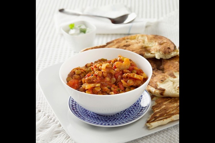 4. يوزَّع خليط العدس الدافئ، على أربعة أطباق، ويُقدَّم مع الزبادي وخبز الـ”نان” الهندي المُحمَّص.