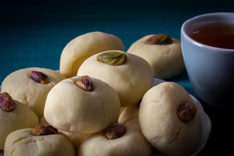 3. خذي كمية صغيرة من العجين، افرديها بواسطة أصابعك ثم لفيها وزينيها بحبة من الفستق الحلبي مع الضغط عليها قليلاً، وضعيها في صينية فرن مغلفة بورقة زبدة.
