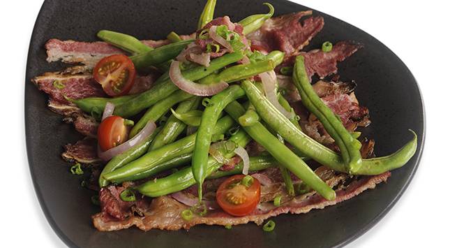 الفاصوليا الخضراء المحمرة مع اللحم البقري المقدد