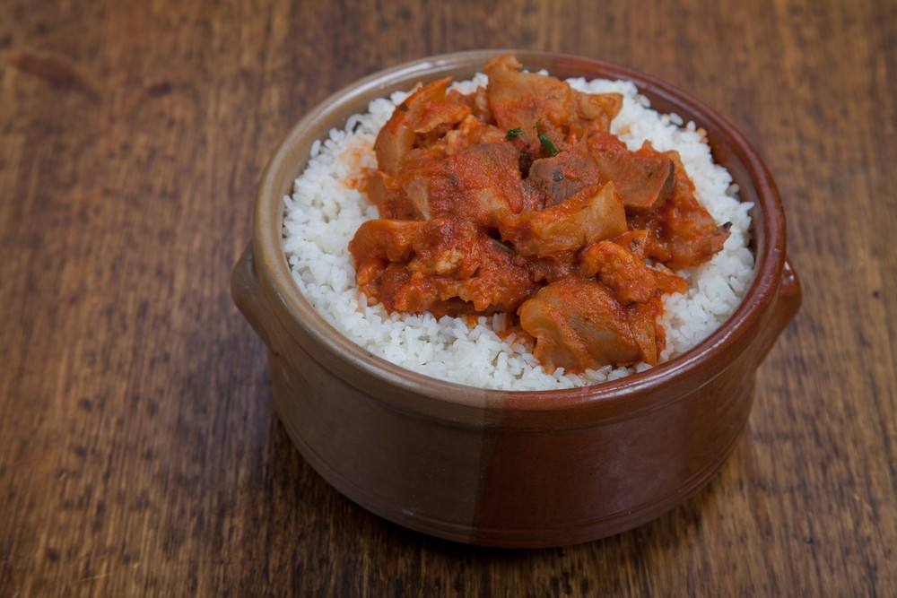 8. يوضع الخبز في الطبق، ويوضع فوقه الأرز، ثم ترص قطع اللحمة.