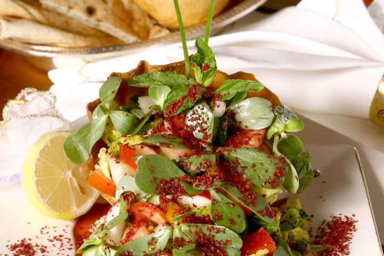 2. ثمّ، نحضّر طبق التقديم، بعد أن نجهّز شريحة الخبز بتشكيلها في قالب على شكل سلّة وقليها في الزيت. وبعد تنشيفها، توضع في طبق التقديم، وتُصبّ مكوّنات الفتوش فيها، ويُزيّن بورق الرجلة والبصل الأخضر ورشّة من السمّاق.