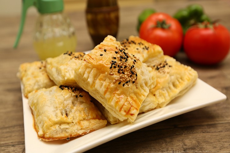 4. وزعي مقدار من الحشو في قطع البف بستيري وأغلقيها على شكل مثل أو مربعات حسب الرغبة.