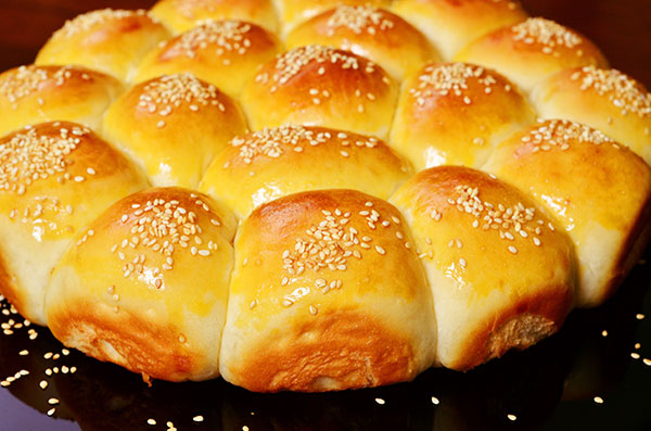 6. امسحي سطح كرات العجين بصفار البيض، من ثم انثري السمسم عليها.