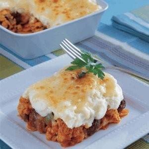 - تُرَشّ الجبنة فوق البطاطس ويُخبَز الطبق في فرن محمّى على حرارة 250 درجة مئوية لمدة 15 دقيقة أو حتى يكتسب الوجه اللون الذهبي.