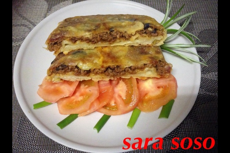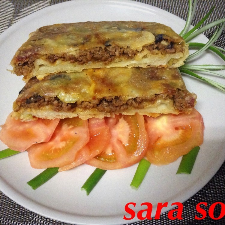 3. تقسم العجينة الى ٦ كرات متساوية وتفرد على القليل من الزيت حتى تصبح عجينة رقيقة جدا ونبدأ بإضافة القليل من حشوة اللحم المفروم مع القليل من حشوة الجبن ونقوم بطي أطراف العجين فوق الحشوة ونبدأ بتسوية الفطيرة على مقلاة متوسطة السخونة بها مسحة من الزيت تقدم ساخنة مع الخضار أو السلطة.