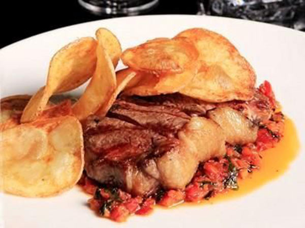 5. في طبق التقديم، توضع صلصة الطماطم والجزر والفليفلة الحمراء والثوم المقلي، يعلوها اللحم، ويزيّن بدوائر البطاطس.