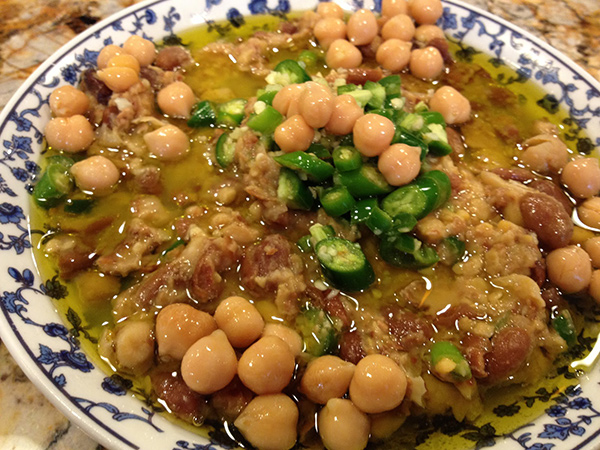 1. نضع الفول المسلوق في وعاء عميق، ونهرسه قليلاً بمهرسة الطعام أو بشوكة، ونضيف عليه الفلفل الحار المفروم، ثم نضيف عصير الليمون الحامض، ونضيف الثوم المهروس، وزيت الزيتون، وبشوكة كبيرة أو بمهرسة الطعام، نهرس المقادير جميعها من جديد لتختلط المقادير جمعها مع الفول، ثم نضيف الملح ونخلط المقادير مجدداً.