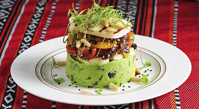 في وعاء تُخلط مقادير التزيين وتوضع أعلى خليط الفول المهروس.