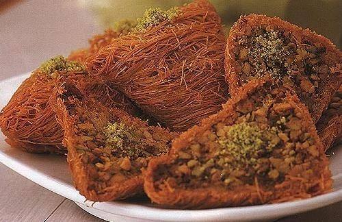 يسكب 100 جرام من الفستق الممزوج بالقطر على طرف واحد من كل قطعة شعر كنافة