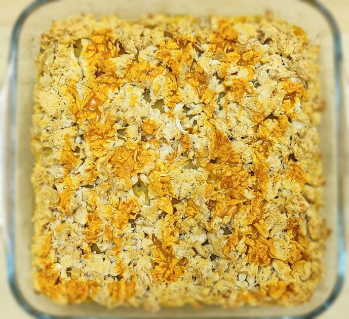 7- غطّي عجينة البطاطس والقرع بالدجاج. أدخلي الصينية إلى فرن محمّى مسبقاً على حرارة 190 درجة مئوية لـ35 دقيقة.