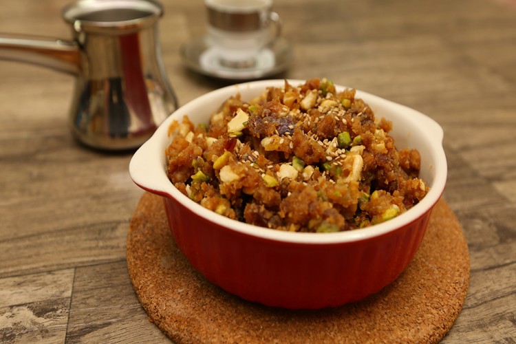 - أضيفي التمر وقلبي لمدة 3 دقائق ثم أضيفي الفستق والكاجو وحركي.