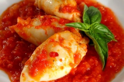 - ثم نحشى بها حبات الكاليمارى ثم نرص الحبات في .صوص الطماطم ونتركها حتى تنضج ل15 -20 دقيقة.