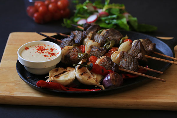 3. وزعي قطع اللحم المتبلة على أشياش الخشب، بالتناوب، مع “كويزات” البصل والبندورة الكرزية ومكعبات الفليفلة الخضراء، وذلك بمقدار 3 قطع لحم في كل شيش.