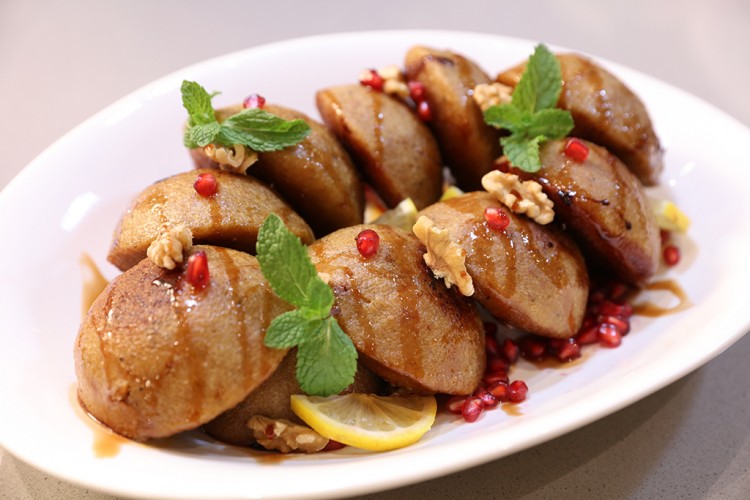 7. ضعي الحشوة بطبق جانبي وأضيفي عليها القليل من الشحم، أو الدهن، والرمان، والجوز المقطع، والفستق الحلبي، والشطة الحلبية، ودبس الرمان، واخلطي المكونات.