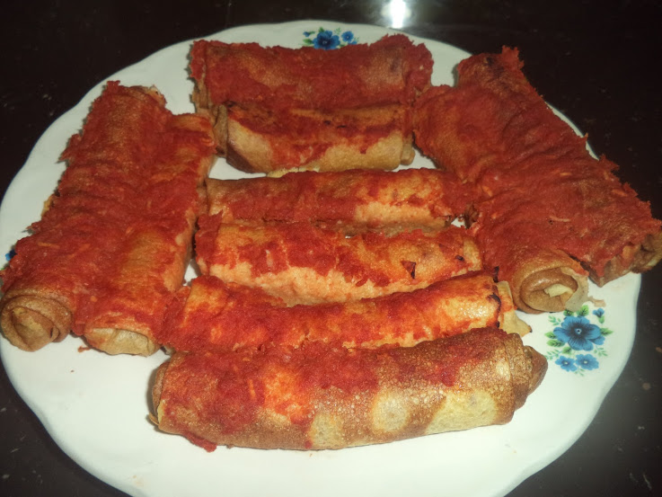 4. نحضر اللحم المفروم مع حبة بصل مفرومة نتركها على النار يستوي مع إضافة الملح والفلفل نحشي حبة الكريب بملعقة من اللحم المفروم ونغلقها رول ثم نغطي الوجه بصلصة الطماطم المحضرة سابقا أو الجاهزة و دخل للفرن لمدة 10 دقائق وتقدم.