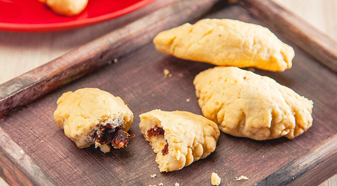 تؤخذ قطع من العجين وتحشى بالحشوة، ثم تغلق على شكل نصف دائرة مع إحكام إغلاق الأطراف.
