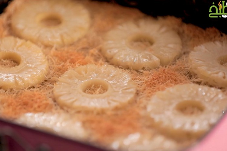 2. تحضير الكنافة:تذويب الزبدة. ثم إضافتها للكنافة وتقليبها جيداً.وضعها في صينية وتسويتها جيداً.إضافة الأناناس على الوجه.توضع في فرن متوسط الحرارة حتى يحمر الوجه.يضاف الشربات البارد.