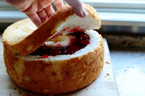 - و بعدين هنحشي الجزء الفارغ من الكعكة بالفراولة مع الجيلي ويجب أن يكون بارد تماماً ان لم يكن كذلك اتركيه في الثلاجة لمدة 15 دقيقة .