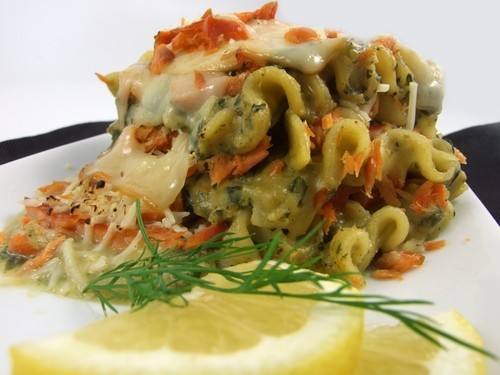5. تضاف طبقةً من مزيج السبانخ مع القليل من سمك السلمون والخضروات وصلصة الطماطم .