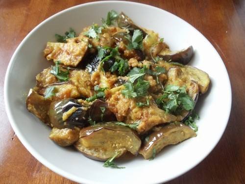 - ضعي الباذنجان في طبق التقديم ويقدم ساخنا مع الأرز .
