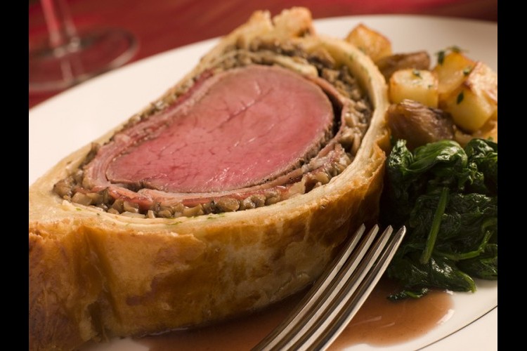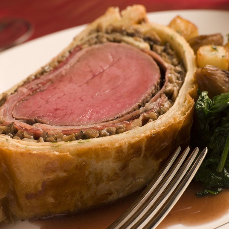 4. تُفرد عجينة الـ”بف” على سطح أملس، وتوضع قطعة اللحم داخلها، وتُلفّ حتى تتغطّى من جهاتها بالعجينة. وتُدهن العجينة من الخارج بالبيض المخفوق، ثم تُصنع شقوق طوليّة رفيعة على سطحها. وتُدخل إلى الفرن، لمدّة 35 دقيقة.