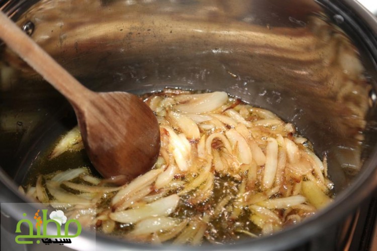 يحمى الزيت على النار ونضع البصل مع التقليب حتى يتغير لونه ويميل إلى اللون الذهبي
