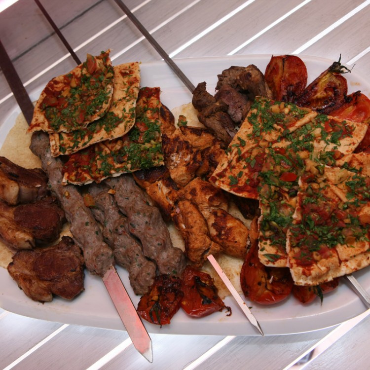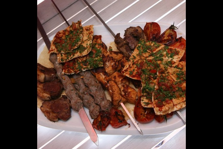 3– يوزّع اللحم بنوعيه والدجاج على أشياش تشوى حتى النضوج، ثم تقدّم ساخنة، ويزيّن الطبق بالخبز العربي والطماطم المشويّة والبصل المشويّ وأوراق البقدونس الأخضر.