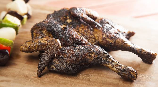 • 1 طائر صغير (دجاج)، مفتوح ومشوي