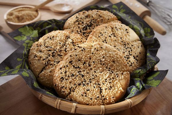 7 إدهني، باستعمال فرشاة عريضة، سطح العجينة بقليل من الزبدة، وانثري السمسم وحبة البركة .