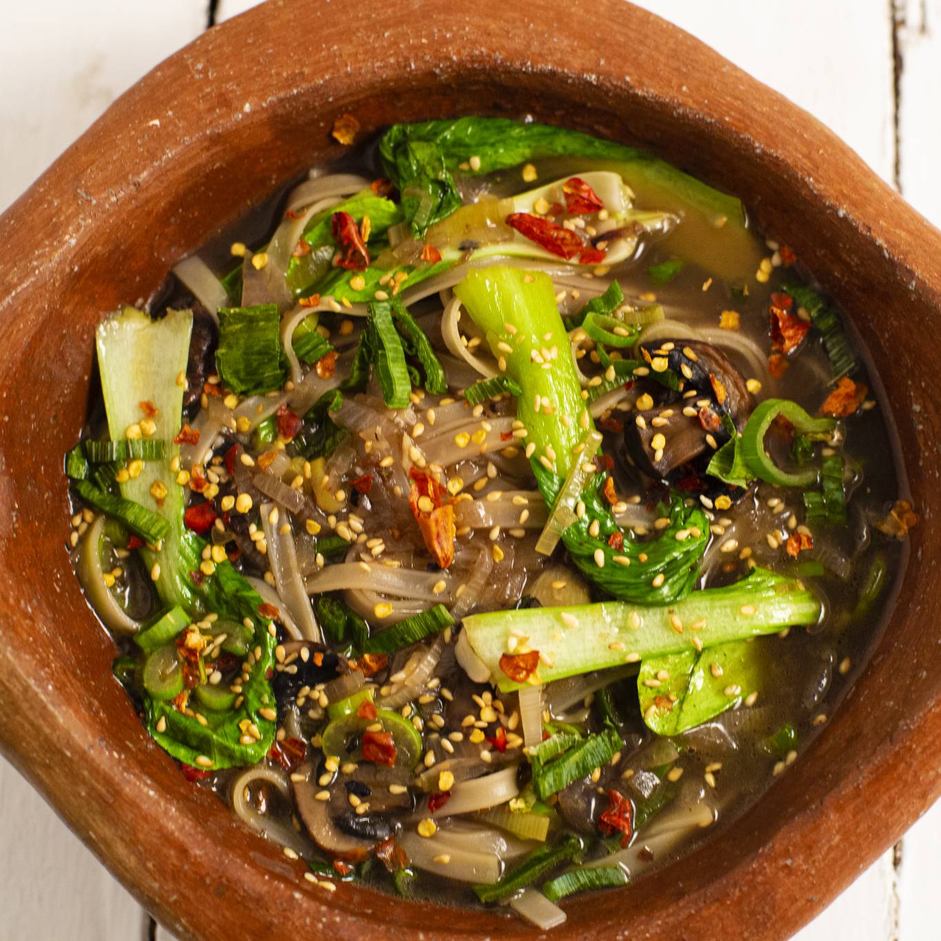يُقدّم الطبق في وعاء ويُزيّن ببذور السمسم والأجزاء الخضراء من البصل الأخضر والأحمر وشرائح الفلفل (حسب الرغبة).