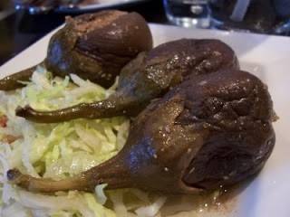 - يُحشي الباذنجان بالحشوة السابقة ويُخلط الباقي بالباذنجان.