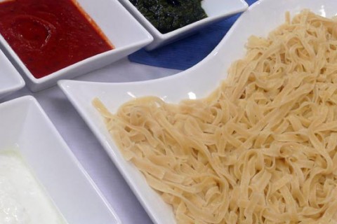 9. بعد تقطيع العجينة الى الشكل المطلوب، ضعيها متباعدة عن بعضها على الفوطة في الصينية، او علقيها على المنشر الخاص بالمكرونة. اتركي المكرونة مكشوفة لكي تجف حوالي 10 دقائق ثم اسلقيها .