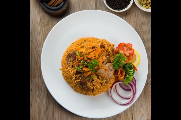 13. حرّكي الأرز بخفّة حتى يتجانس لونه ثمّ ضعيه في طبق التقديم وضعي فوقه قطع اللحم.