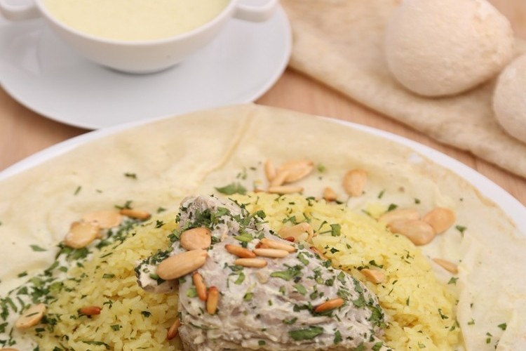 - طريقة التقديم: يفرد الخبز في صينيّة التقديم، ويسكب القليل من اللبن المطبوخ فوقه حتَّى يتبلَّل. ثمَّ، يُضاف الأرز، ويُسكب فوقه القليل من اللبن، فاللحم. وتُزيّن الصينيّة بالبقدونس والمكسّرات المحمّصة.