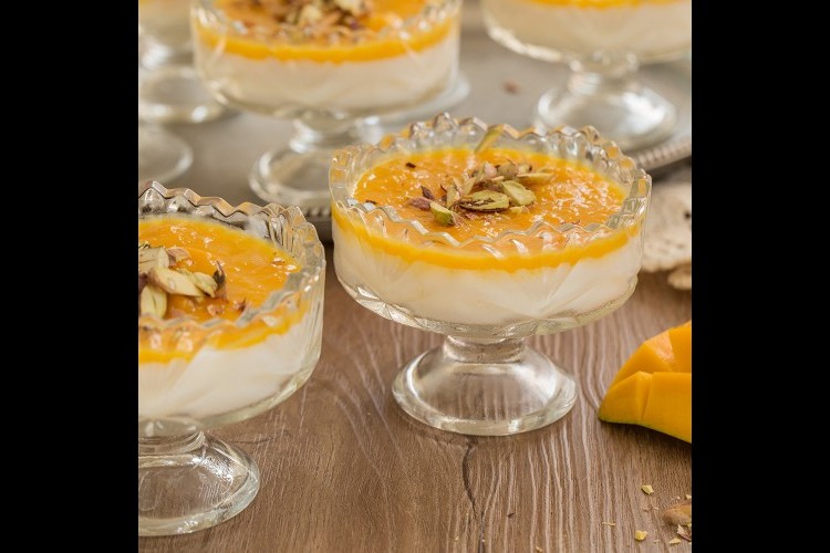 1. لإعداد خليط المانغو والزعفران: تُضاف قطع المانجو والزعفران معًا إلى وعاء، وتُدع لنصف ساعة جانبًا، ثمّ يوضع الخليط في قدر على النار. يُذوّب الجيلاتين في ملعقتين من الماء الساخن، ثمّ يُضاف إلى خليط المانغو، مع التقليب، وذلك حتّى يُشارف الخليط على الغليان. ثمّ، يُرفع عن النار، ويترك يبرد.