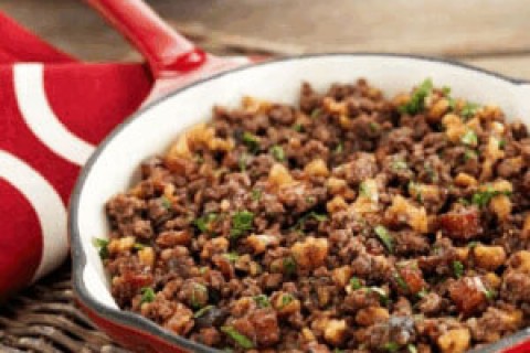 - تُسخّن الزبدة في قدر، ثمّ يُضاف اللحم وأوراق الكزبرة وتُقلى مع التحريك لمدّة 10 دقائق على حرارة متوسّطة.