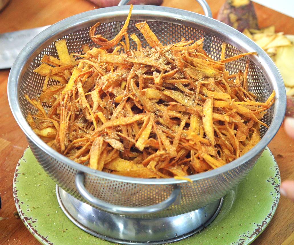 نقوم بتقطيع البطاطس و البطاطا لشرائح رفيعة جدا ثم إلى أصابع .