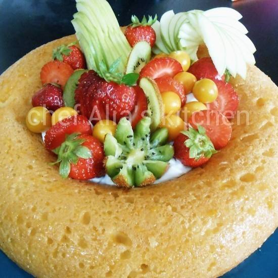 - وبعد ان تبرد تسقى بالشربات الساخن تزين بالكريمة المخفوقة والفواكه وتقدم .