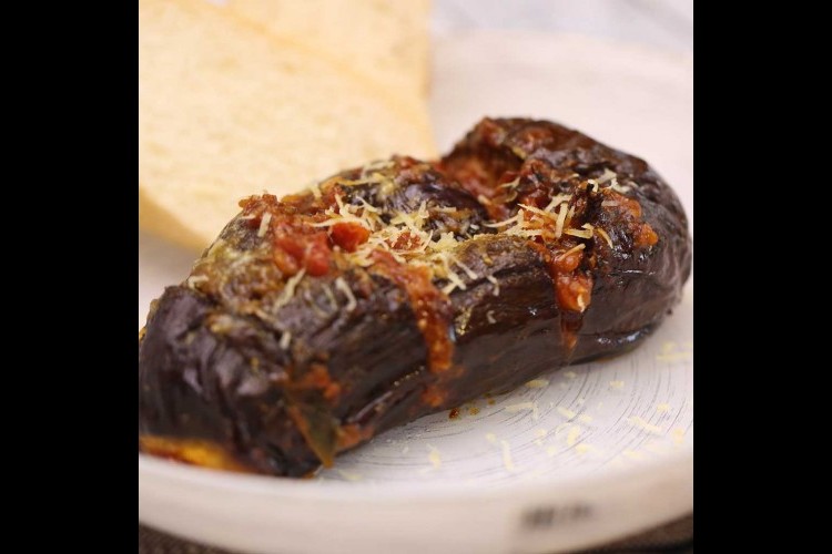 1. يقطع الباذنجان إلى شرائح مع عدم قطعها تماما ثم تتبل كل حبة بالقليل من الملح والفلفل.