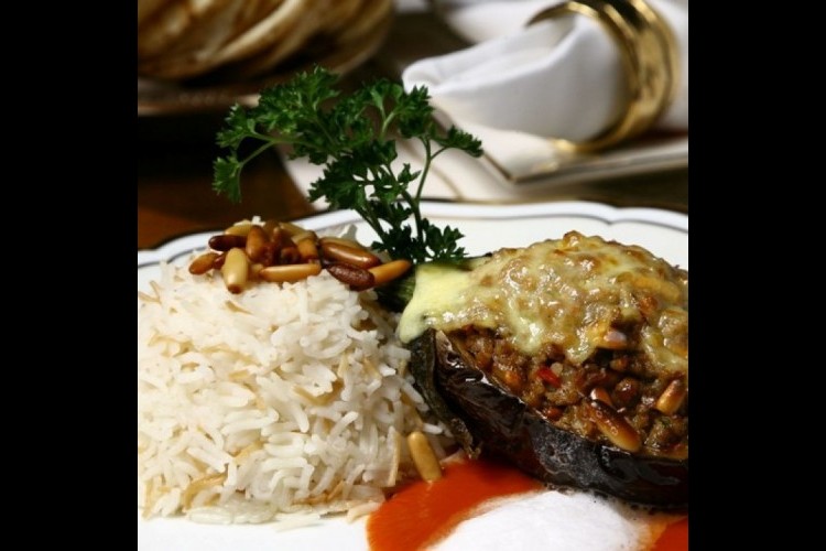 2. لإعداد الصوص: تضرب الطماطم في الخلاط وتوضع في طنجرة مع رشة من الملح ورشة من البهار ويضاف إليها كوب من الماء وتترك حتى تغلي، ثم ترفع من على النار وتصفى، نضع اللحم المفروم فوق أنصاف الباذنجان، تسكب صلصة الطماطم ويرش فوقها جبن الموزاريلا وندخلها إلى الفرن لمدة خمس دقائق على درجة حرارة 190 درجة، يقدم معها الأرز بالشعيرية.