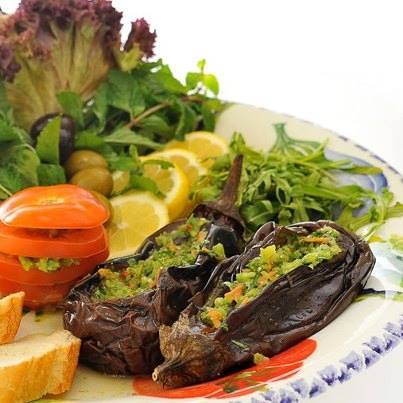 - يُحشى الباذنجان بالخليط السابق، يُرص في طبق التقديم، ويُقدم مع الخضروات الطازجة، الجبن وشرائح الخبز.