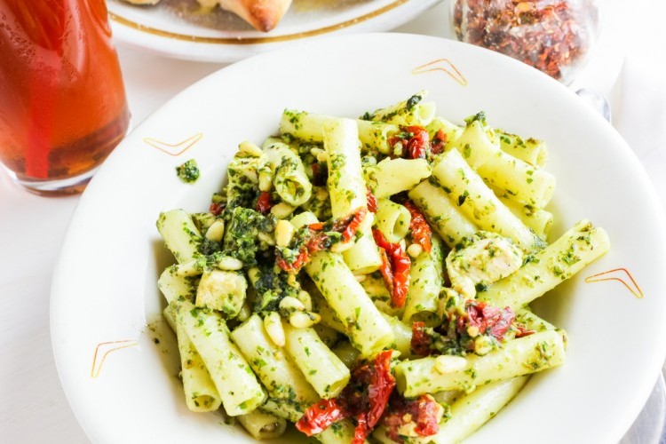 - ضعي الباستا في طبق وأضيفي الدجاج وصلصة البستو والطماطم المجففة وحركي المزيج وقدميها ساخنة.
