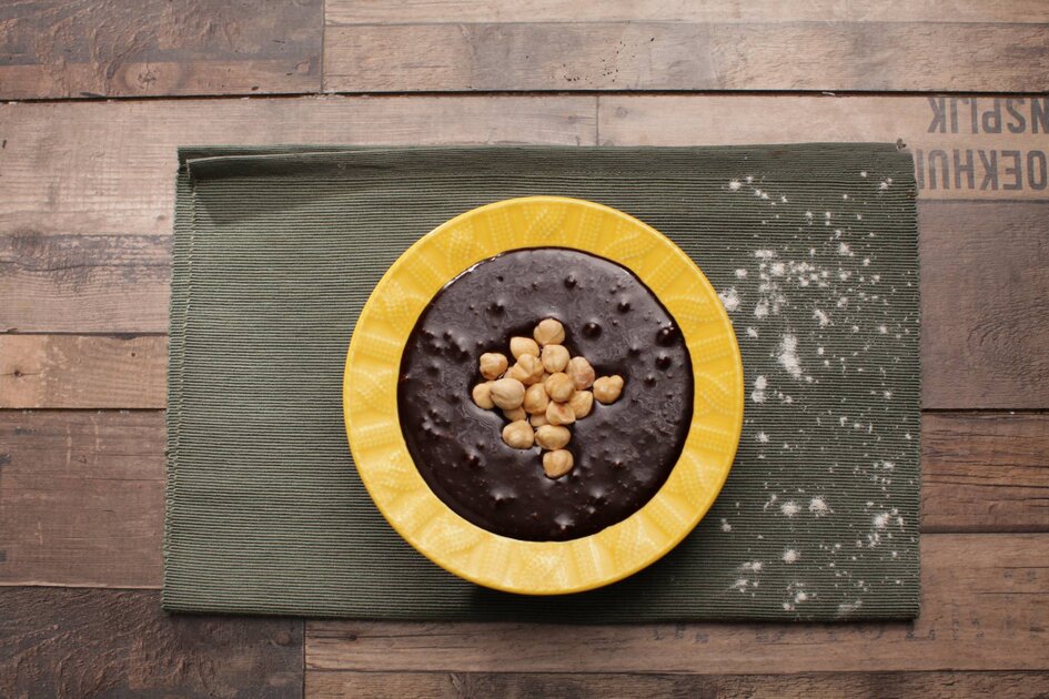 يتم ضرب البندق فالخلاط ثم تضاف باقي المكونات لل خلاط مع صب الشيكولاتة المذابة.