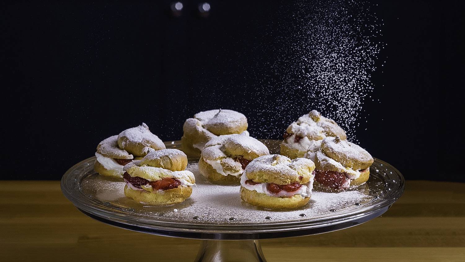 تقطع العجين المخبوزة بالنصف و تحشى بالخليط مع شرائح الفراولة و تقدم مزينة بالسكر البودرة بالهنا