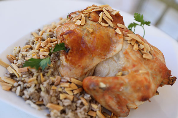 6. ضعي الدجاجة بصينية الفرن وصبي ما مقداره كوب من الماء على جوانب الدجاجة وأدخليها للفرن لمدة ساعتين. وحين النضوج انقليها على طبق التقديم وضعي كمية من أرز الحشوة المفلفل وزيني بحبات اللوز المقلي.