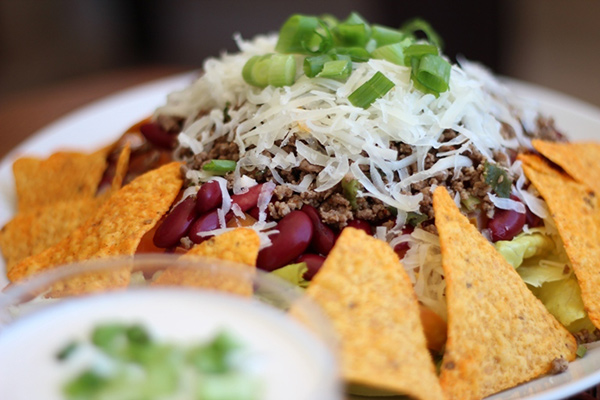 4. نضيف رقائق الذرة على حواف الطبق ويزين بالبصل الأخضر