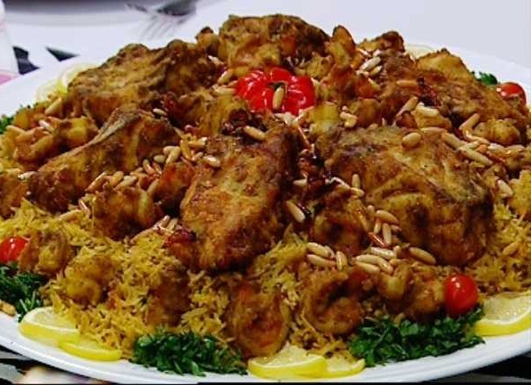 15. أسكبي الأرز في طبق تقديم واسع. وزعي السمك والروبيان. زيني بالبصل المقلي والصنوبر المقلي. قدمي الصيادية مع السلطة الخضراء أوالدقوس الحار.